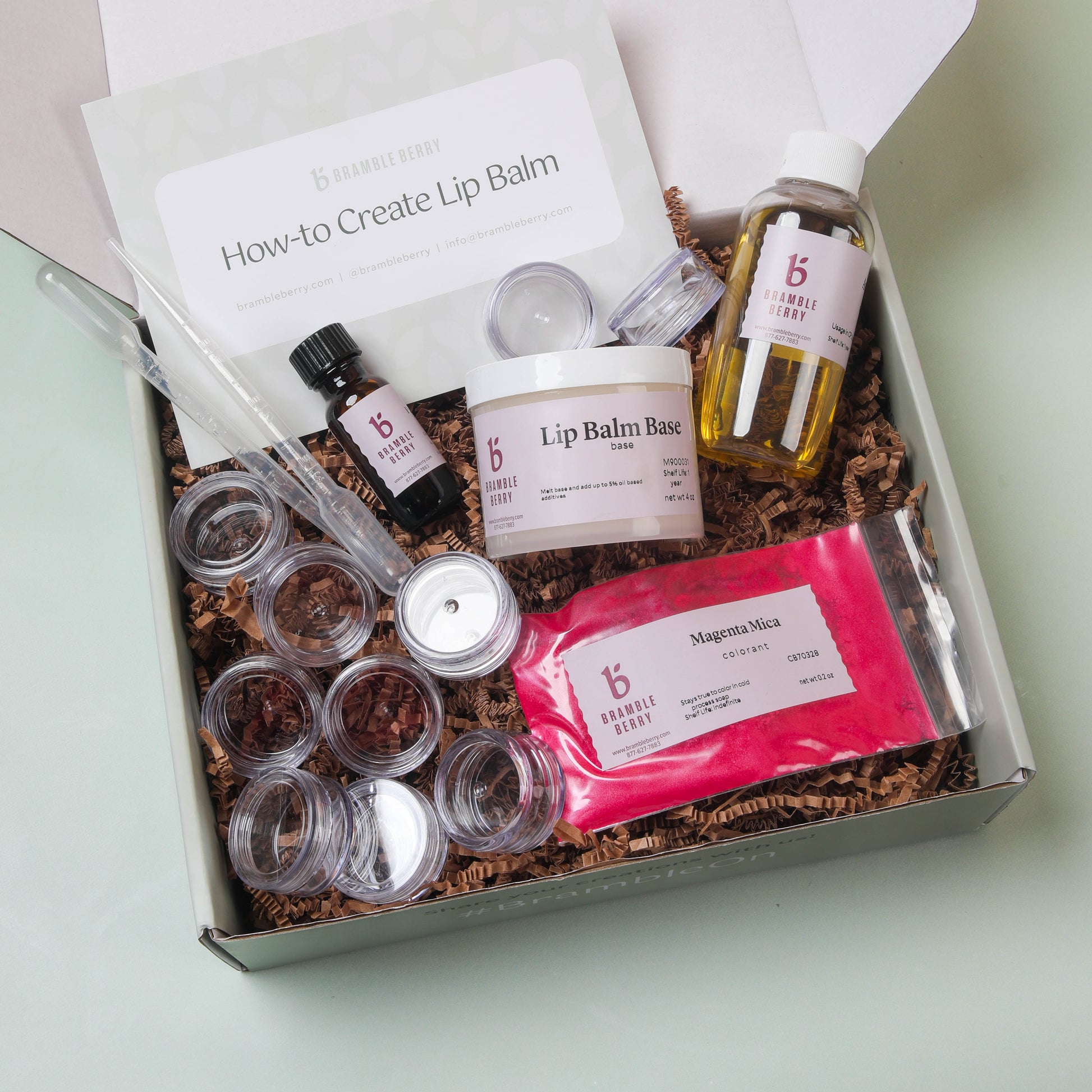 Get ready to craft your own luscious, moiustirzing lip balms with our Mini Lip Balm-Making Kit. Perfect for crafting parties or a cozy solo project, this beginner-friendly kit lets you blend up 10 custom lip balms in just twenty minutes. We've added nourishing Avocado Oil for extra moisture and to make this lip balm extra spreadable. This kit includes lip-safe Magenta colorant that allows you to create anything from a subjtle tint to a bold, lipstick-like vibrancy. Tip: Stick a knife in the freezer, then dip into the melted, colored lip balm base to see just how much color your Magenta will impart on lips. This kit also has mini droppers to help fill the lip butter pots.