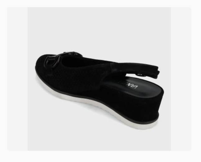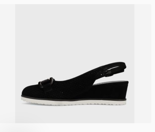 Almond-toe perforated suede slingback. Tonal metal bit. Padded insole. 2 inch covered wedge heel. Grooved rubber sole.