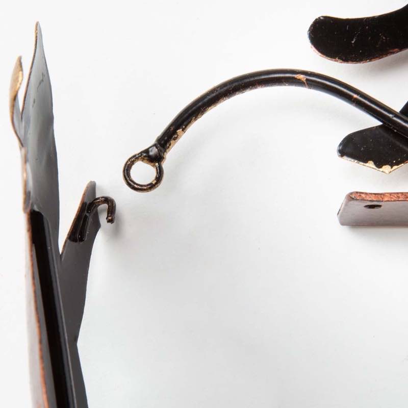 The two parts hook together at the corner of the door or window frame, and the piece can be secured in place with a small tack or brad (not included). Each piece is handcrafted from reclaimed metal and treated with a dark copper-colored finish with golden highlights. Wind & Weather Exclusive Design.