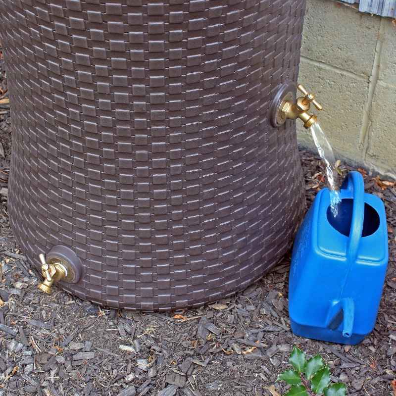 This attractive rain barrel has two offset rust resistant brass spigots; one accommodates a 5 gallon bucket or watering can, and the other attaches to a garden hose. These can be used simultaneously, or use the second spigot to attach to a second barrel.