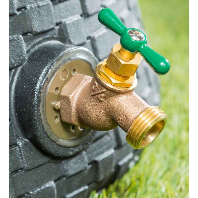 - Two rust resistant spigots: lower attaches to a hose, higher is for buckets or watering cans